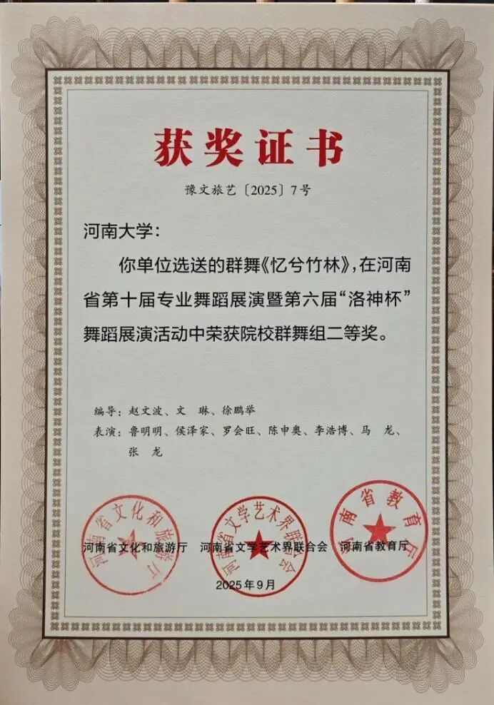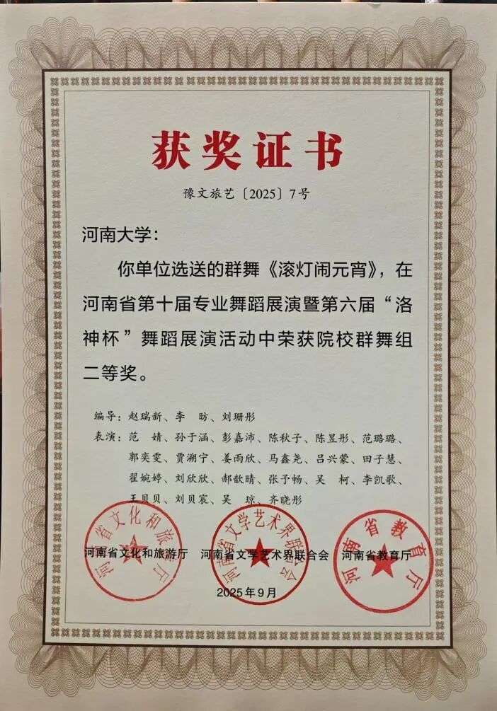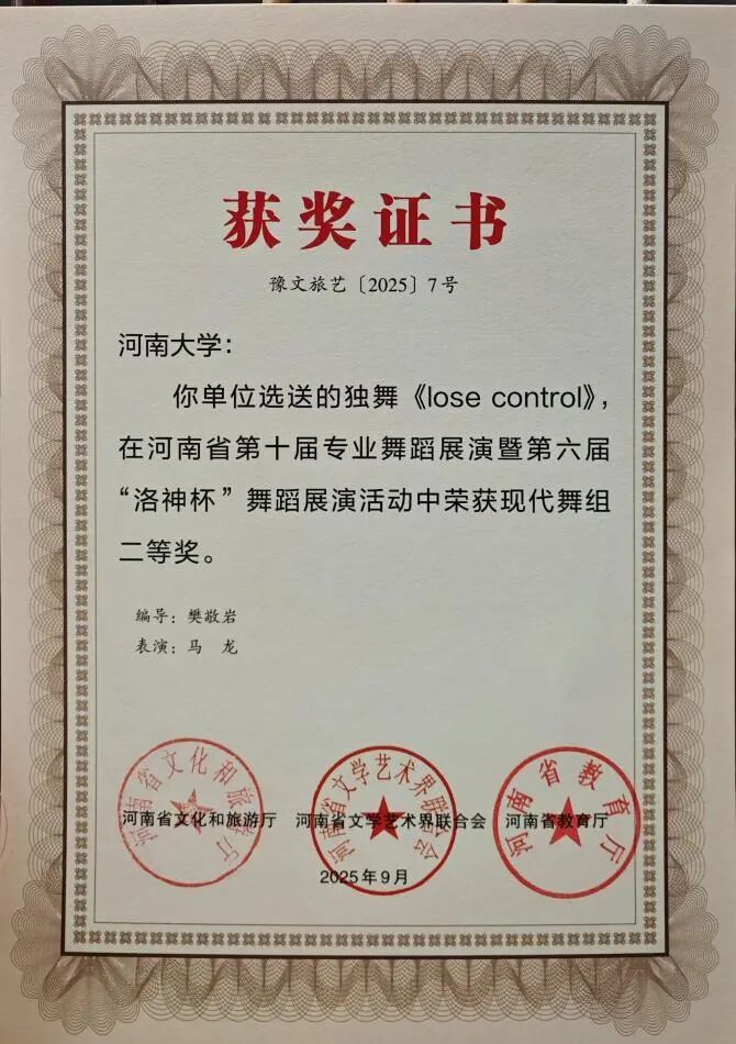 舞蹈展演方面包括二等奖4项:原创当代舞群舞《又见“南泥湾”》,原创古典舞《滚灯闹元宵》《忆兮竹林》和原创现代舞独舞《lose control》;