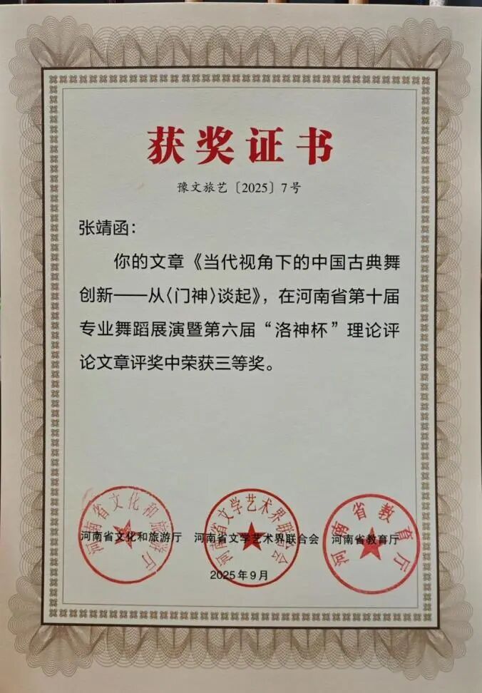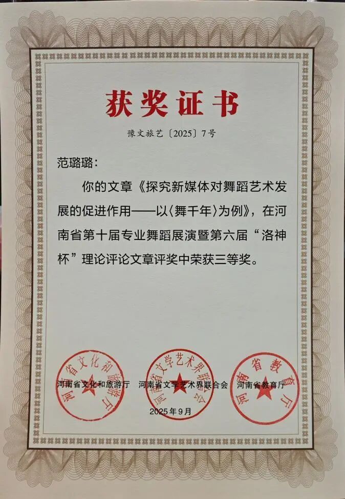 三等奖3项:《失衡与平衡的思考——观舞剧〈坠落者〉》《当代视角下的中国古典舞创新——从〈门神〉谈起》《探究新媒体对舞蹈艺术发展的促进作用——以〈舞千年〉为例》。