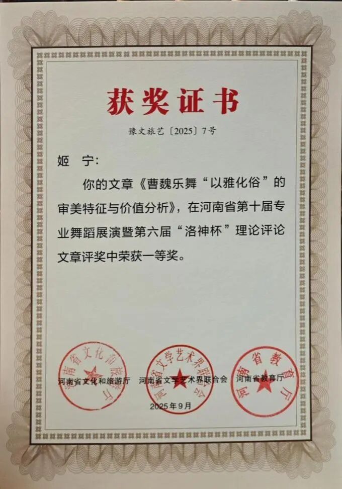 舞蹈理论评论方面包括一等奖3项:论文《曹魏乐舞“以雅化俗”的审美特征与价值分析》《新媒体视域下中国古典舞创作的机遇与挑战》《舞剧〈雷和雨〉中叙事手法的运用研究》;