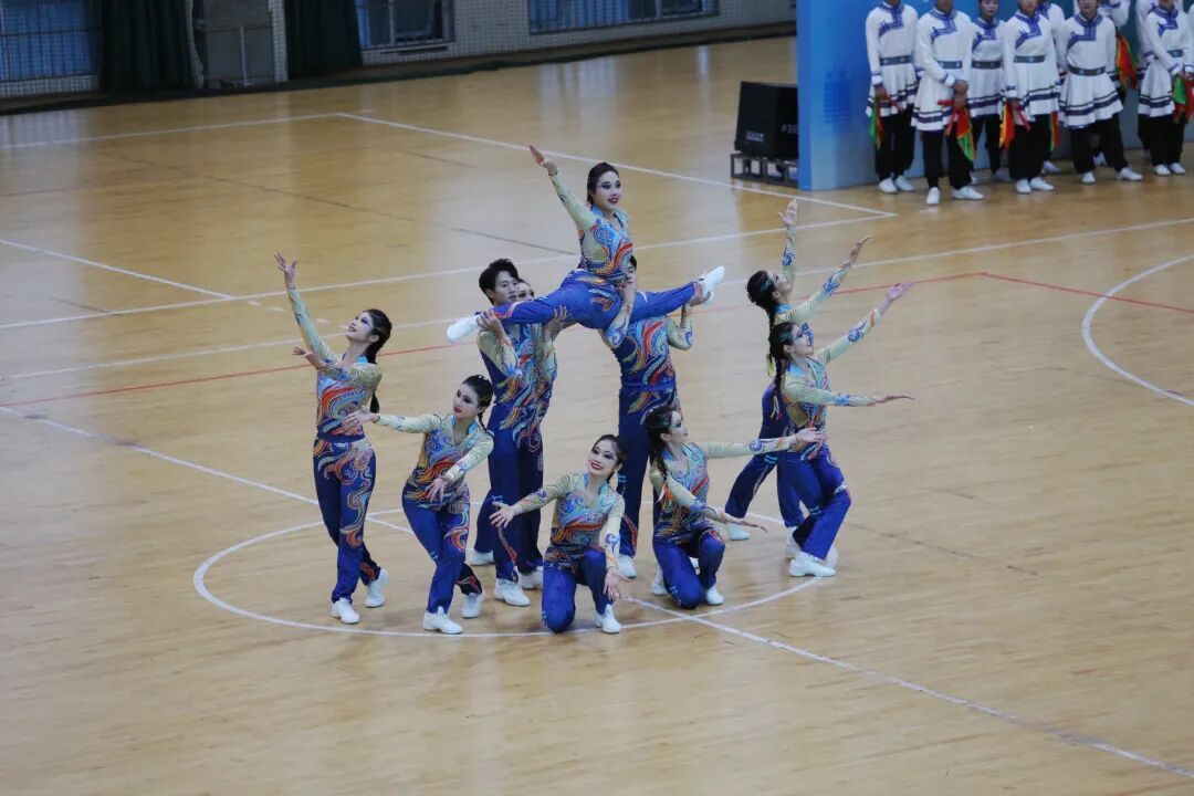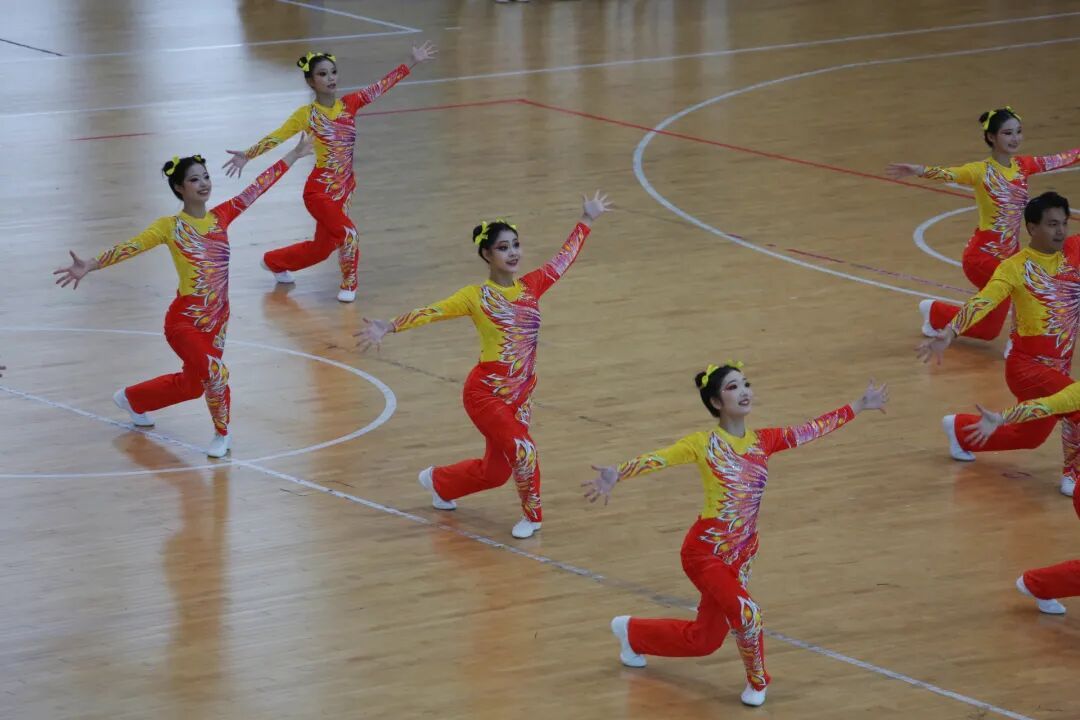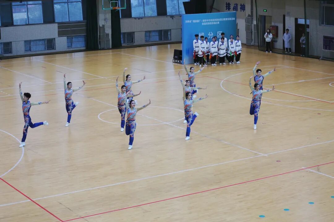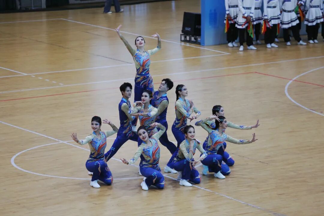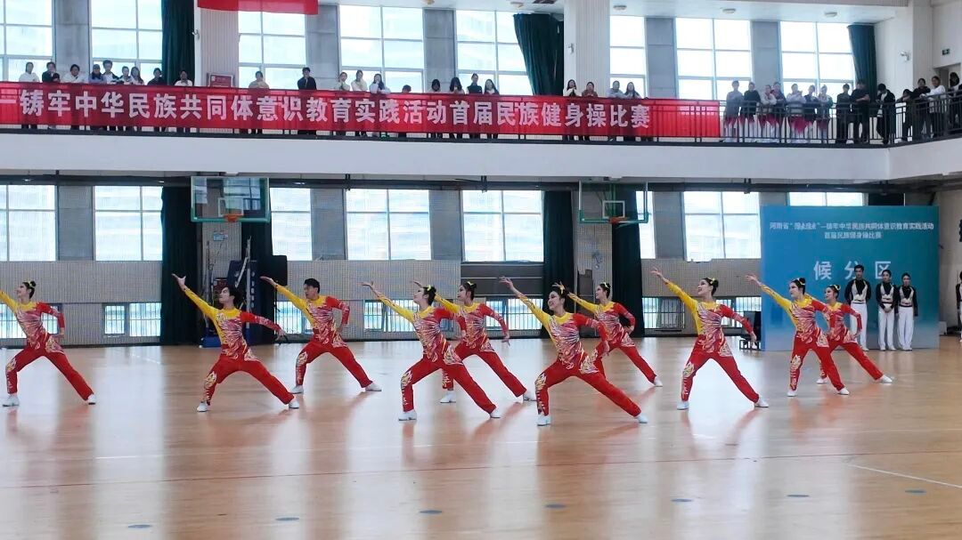 在54组代表队、800余名运动员的激烈角逐下精彩绽放。规定套路组严守《锦绣大中华》竞赛标准,手臂角度、步伐间距皆精准把控,整齐动作里,运动员的纪律性与舞蹈生的韵律感交融。原创自选套路组深挖多元民族文化,维族的旋转、藏族的舒展、傣族的柔刚与鼓子秧歌的酣畅在编排中共生,让民族团结的种子在青春律动中生根,充分契合赛事“豫来豫亲”的民族融合内核,获得评委高度认可。