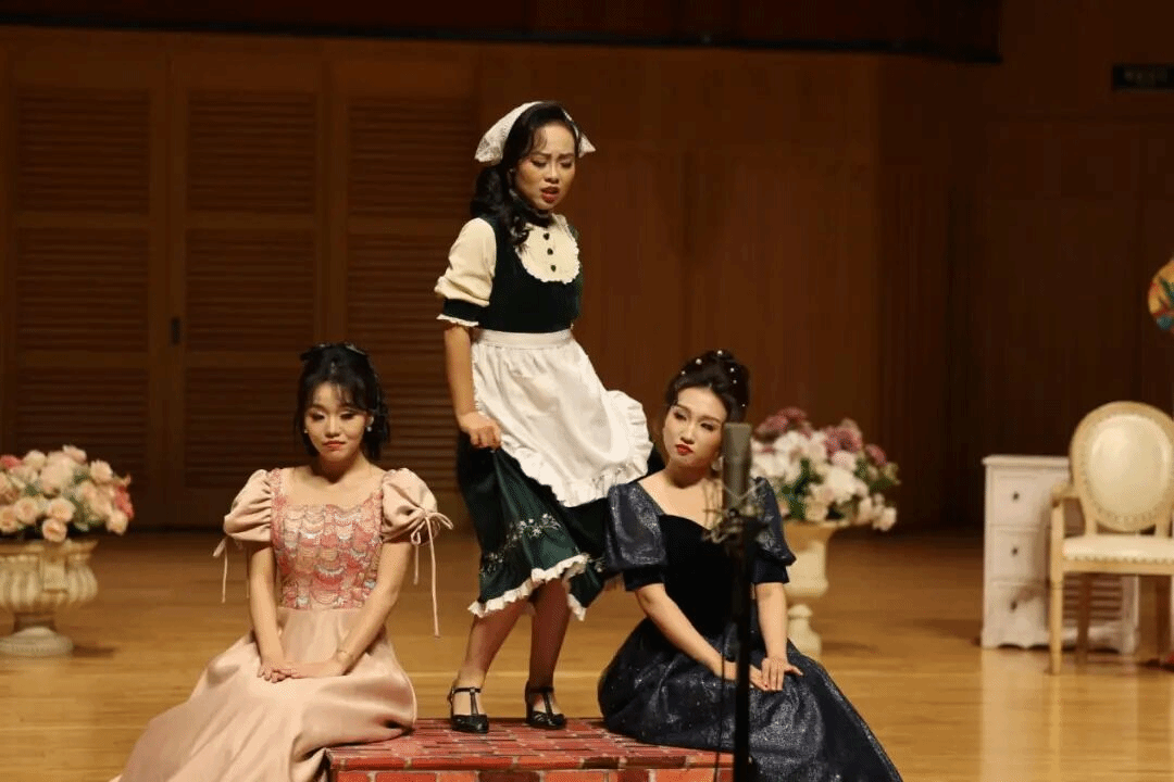 “艺术的探索从无定式,教学的实践更需扎根舞台。”继成功执导《费加罗的婚礼》后,韩梅教授延续“低成本、小制作、高水平”的创作理念,推行环保型歌剧演绎,始终围绕“研究-教学-创作-实践”的一体化教学目标。此次排演中,她不仅指导学生完成歌剧编创,更鼓励学生深度参与道具、布景、服装的设计与制作,从剧目排演到舞台呈现全程投入。这一过程既拓展了学生的主创能力、培养了创新意识,更让学生在团队协作中树立团队精神、提升协作能力,实现了“在实践中学习、在创作中成长”的育人效果。