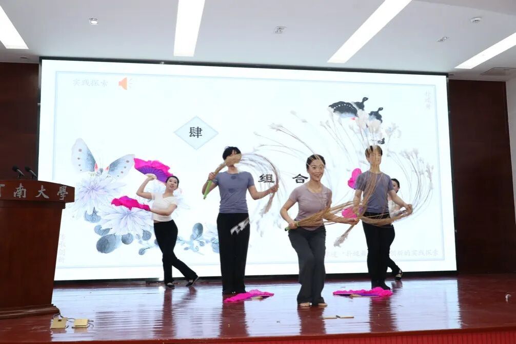 舞蹈编导专硕研究生贾溯宁、司雨、陈昱彤主讲的《鱼灯豫韵——河南传统民间舞蹈鱼灯舞的道具配合性训练》,以河南民间传说为背景,生动讲述鱼灯舞的起源与风格,巧妙融合扇子与鱼灯,感受发力逻辑与运动轨迹,赋予“水”与“游鱼”的意象表达。团队创新探索了道具手位与握法,结合传统阵型,强化道具间的联动配合,具象呈现“游鱼戏水”的灵动场景。