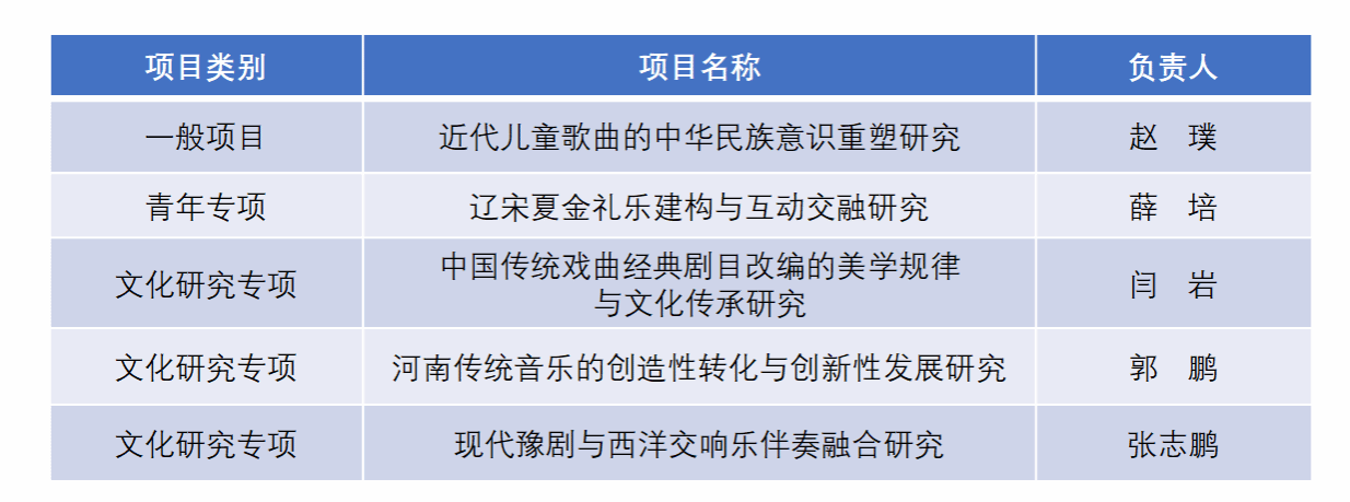 国家级项目包括,国家社科基金重大项目1项、一般项目1项、后期资助项目1项;国家艺术基金艺术人才培训项目1项。