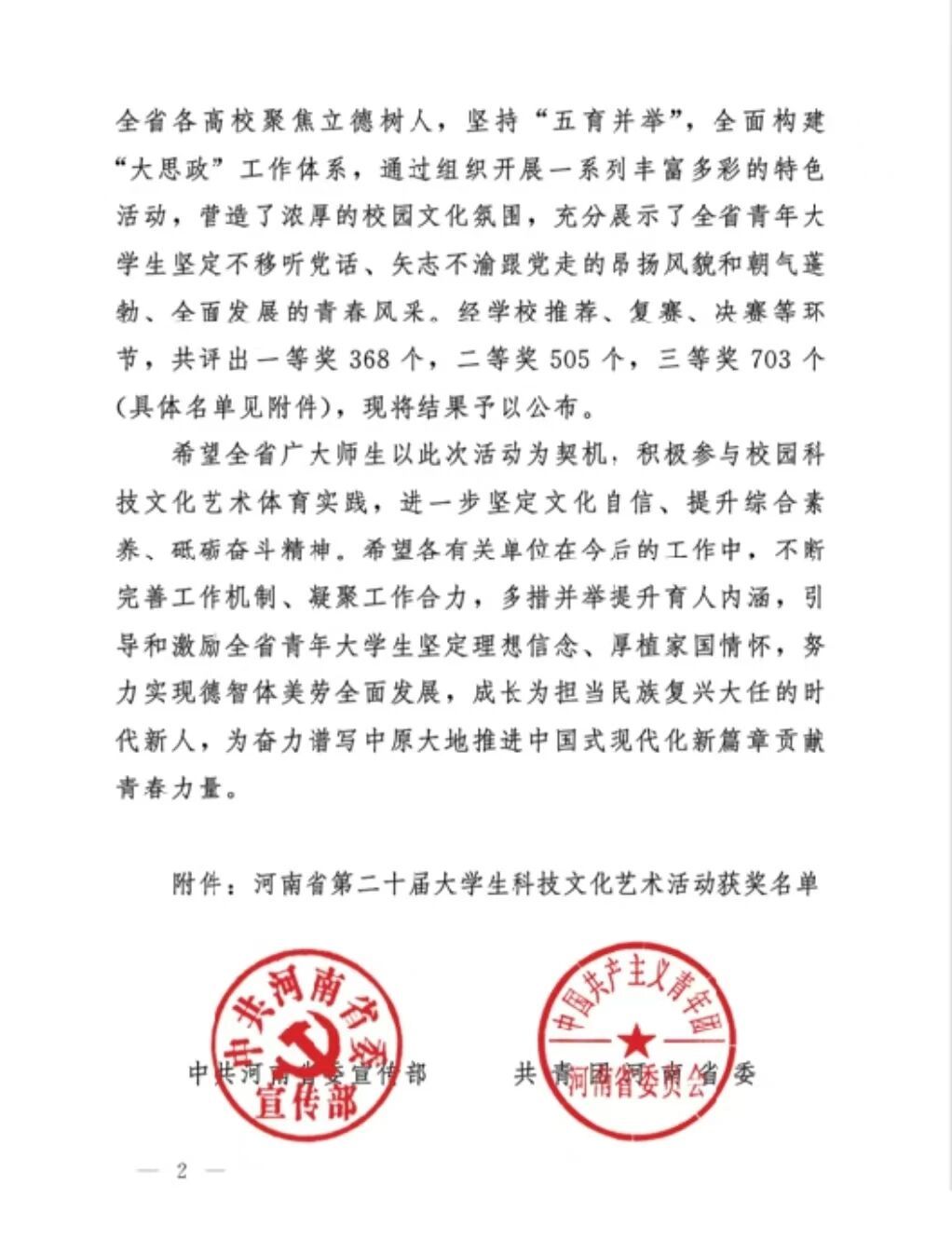 多位指导教师荣获“河南省第二十届大学生科技文化艺术节优秀指导教师”称号。